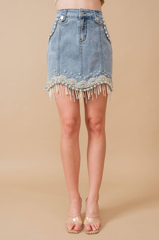 80038S - Stretch Denim Embellished Pearl Fringe Mini Skirt: MED WASH / L