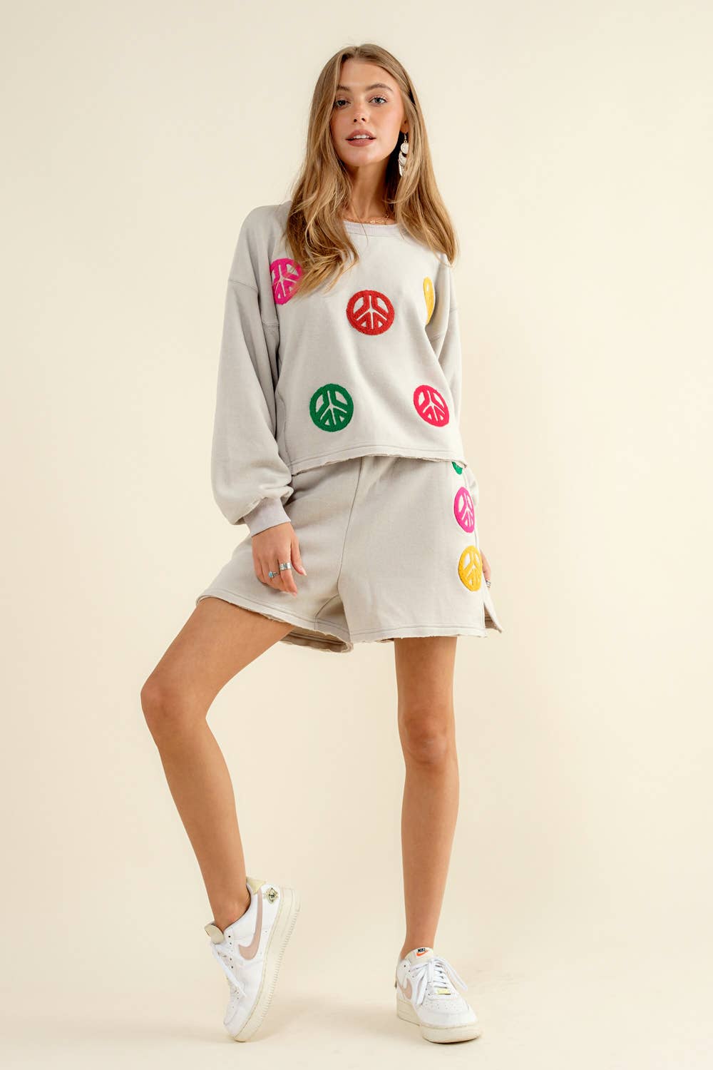 Fleece Soft Terry Multi Peace Patchwork Frayed Edge Pullover Top with Matching Shorts Set
